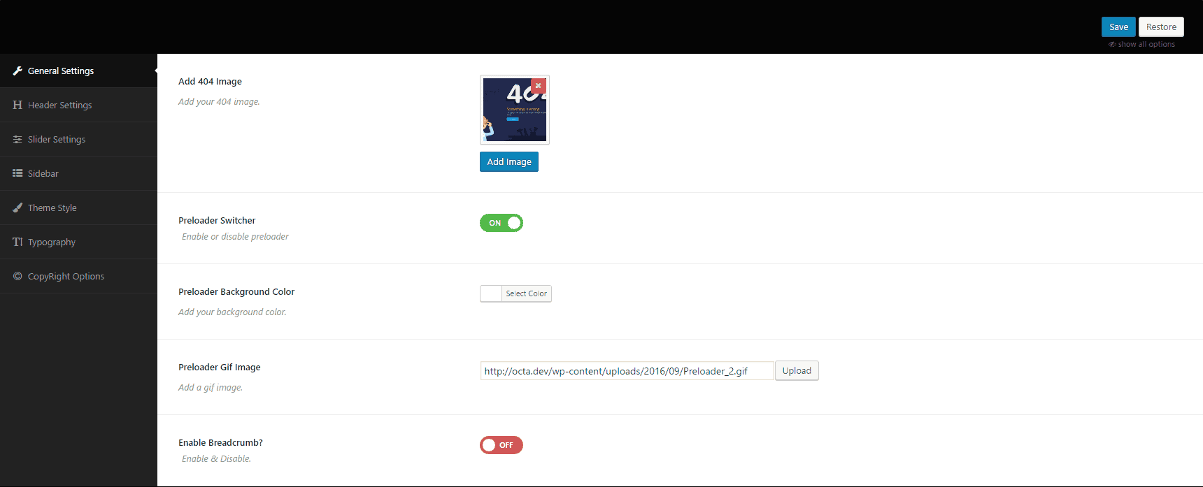 General Settings: Preloader option, breadcrumb, 404 Page Image