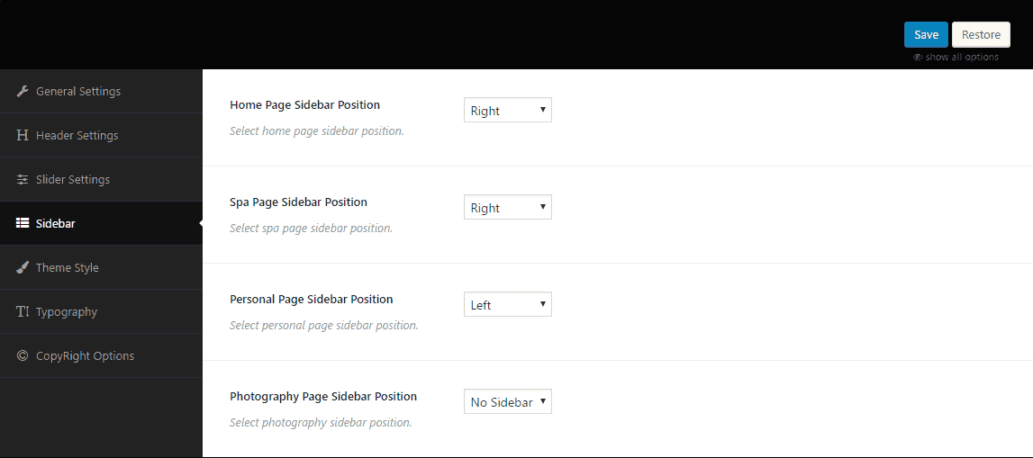 Sidebar: Select Options for Right sidebar, Lft Sidebar, No-Sidebar position.