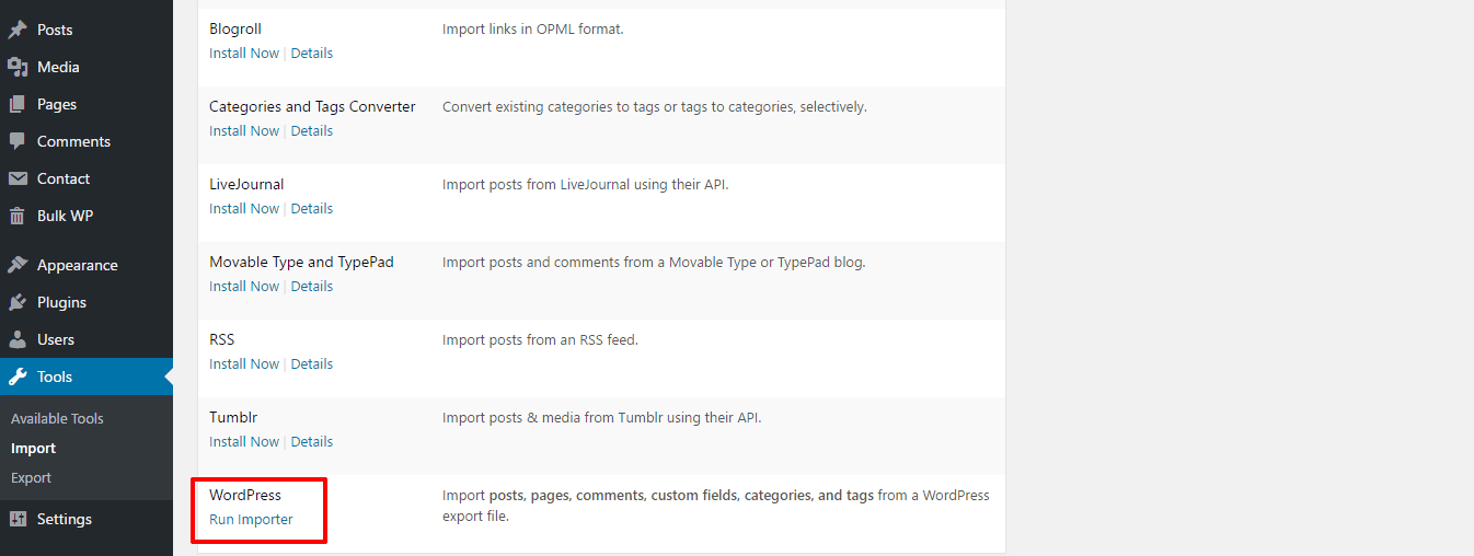 Install the WordPress Importer plugin, if you haven't got installed one yet.
