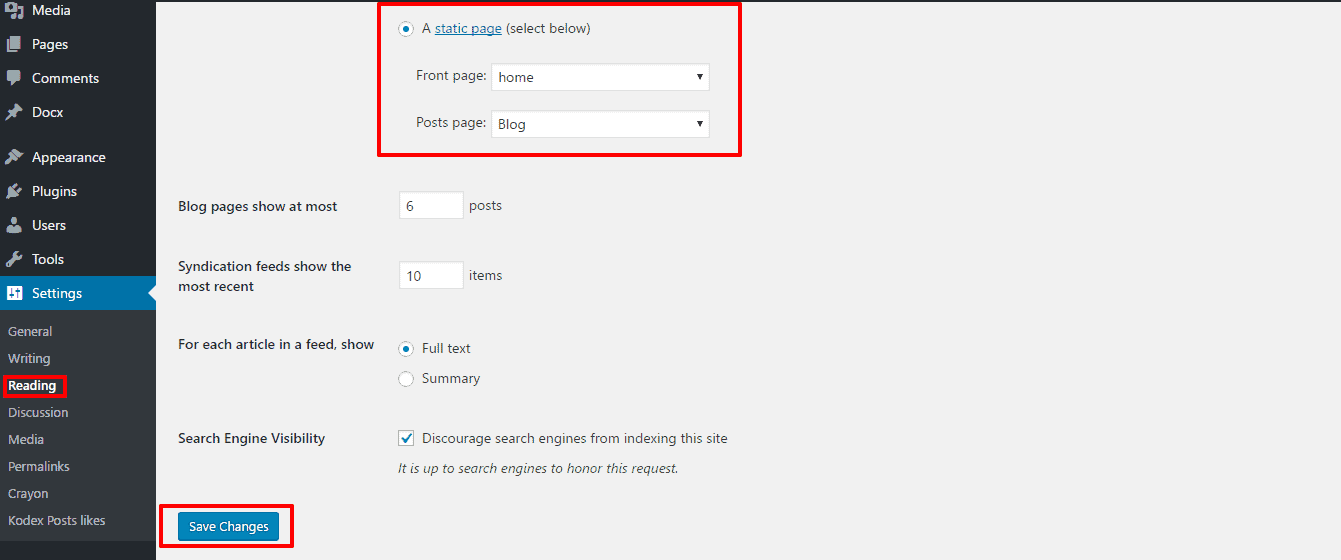 - Choose a "Static Page( select below)" in first option "Front page displays"