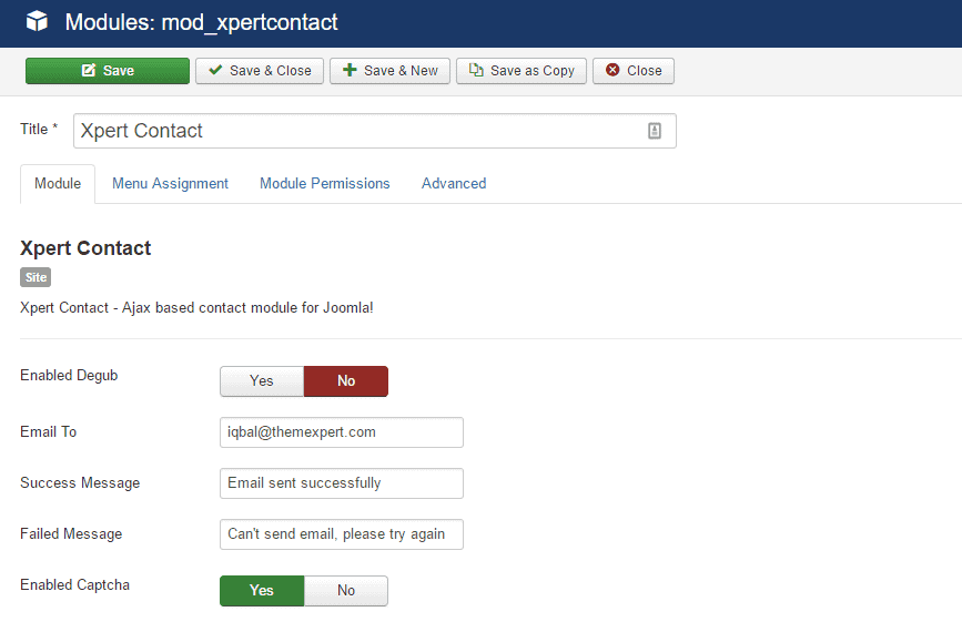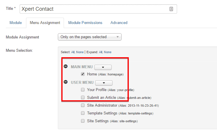 - Under the Menu Assignment tab, select the page where you want to show the module.