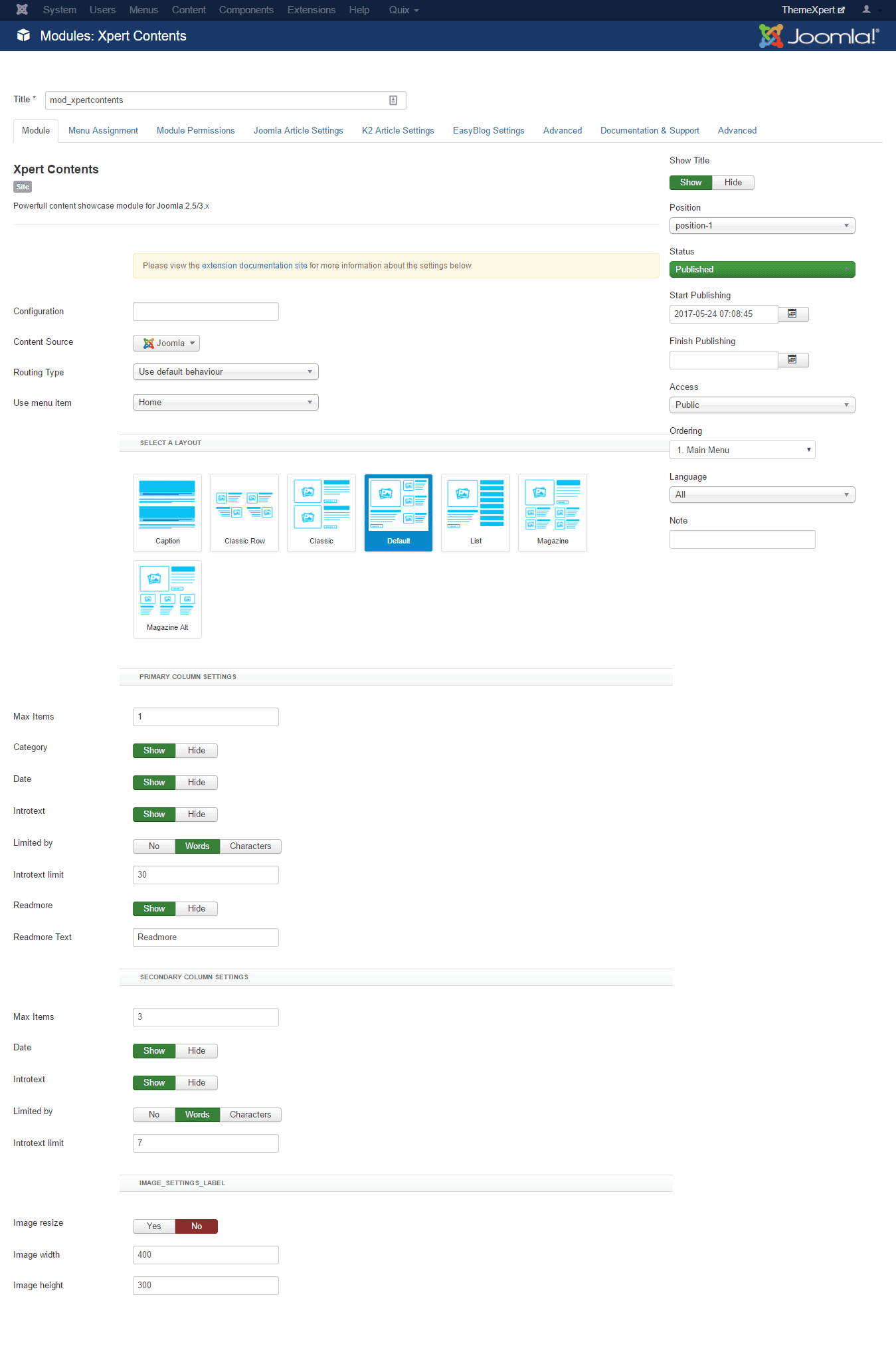 - Introtext limit : Define the number to make the limitations of introtext.