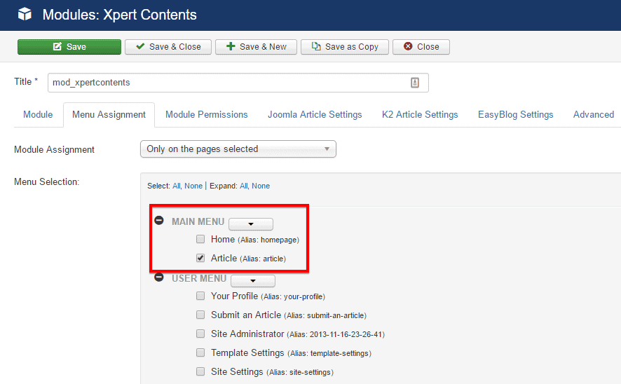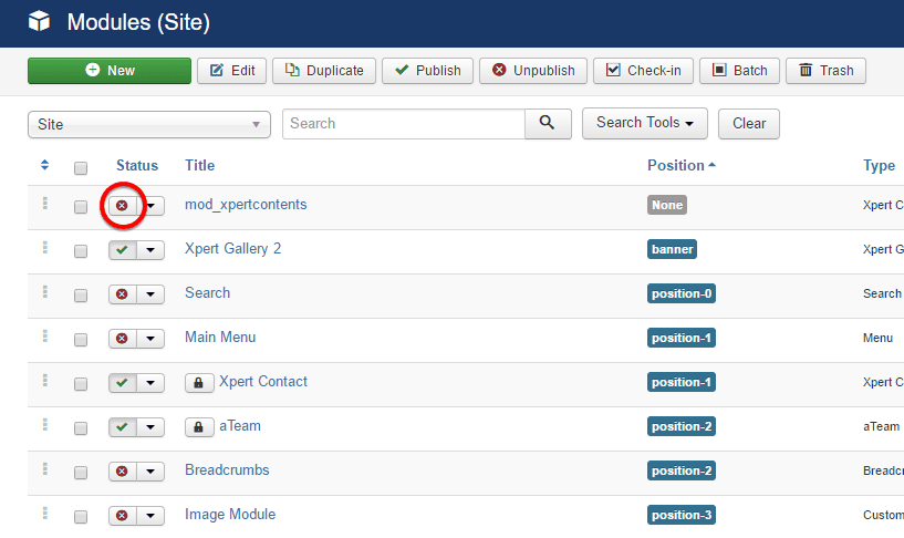 Extensions> Modules - Find the mod_xpertcontents and click on the pointed area like the screenshot to enable it.