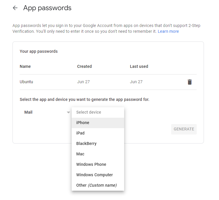 Now, you can set up an app password in your Google account. An app password works like an alternate password for your account. It can only be used by the applications you share it with, so it’s more secure than sharing your primary password.