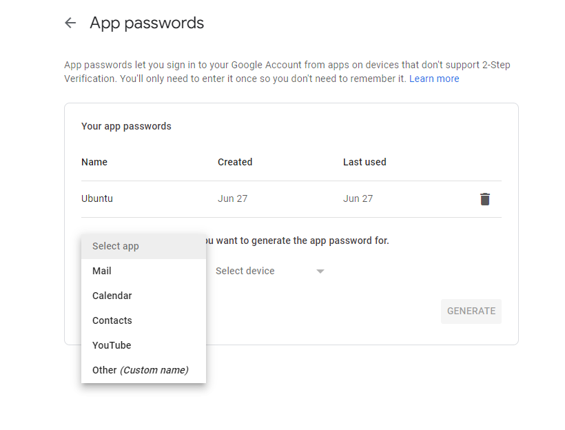 To do so, go to Google Account > Security > Signing in to Google > App passwords.