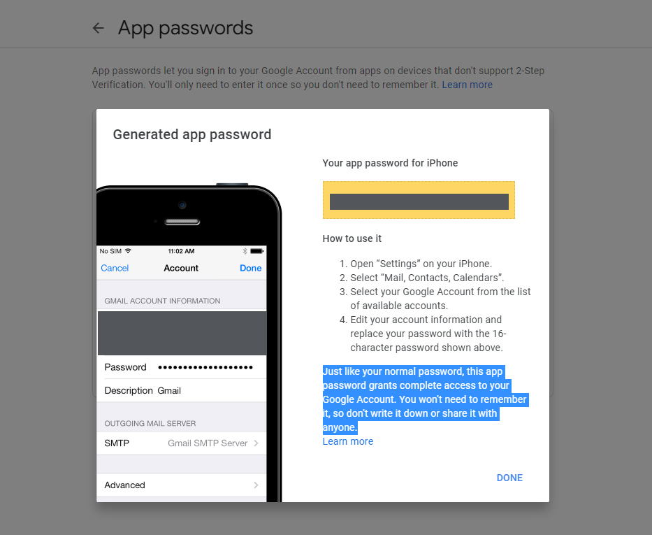 Note: Just like your normal password, this app password grants complete access to your Google Account. You won't need to remember it, so don't write it down or share it with anyone.