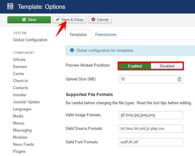 - Make sure that the Preview Module Positions is set Enabled.