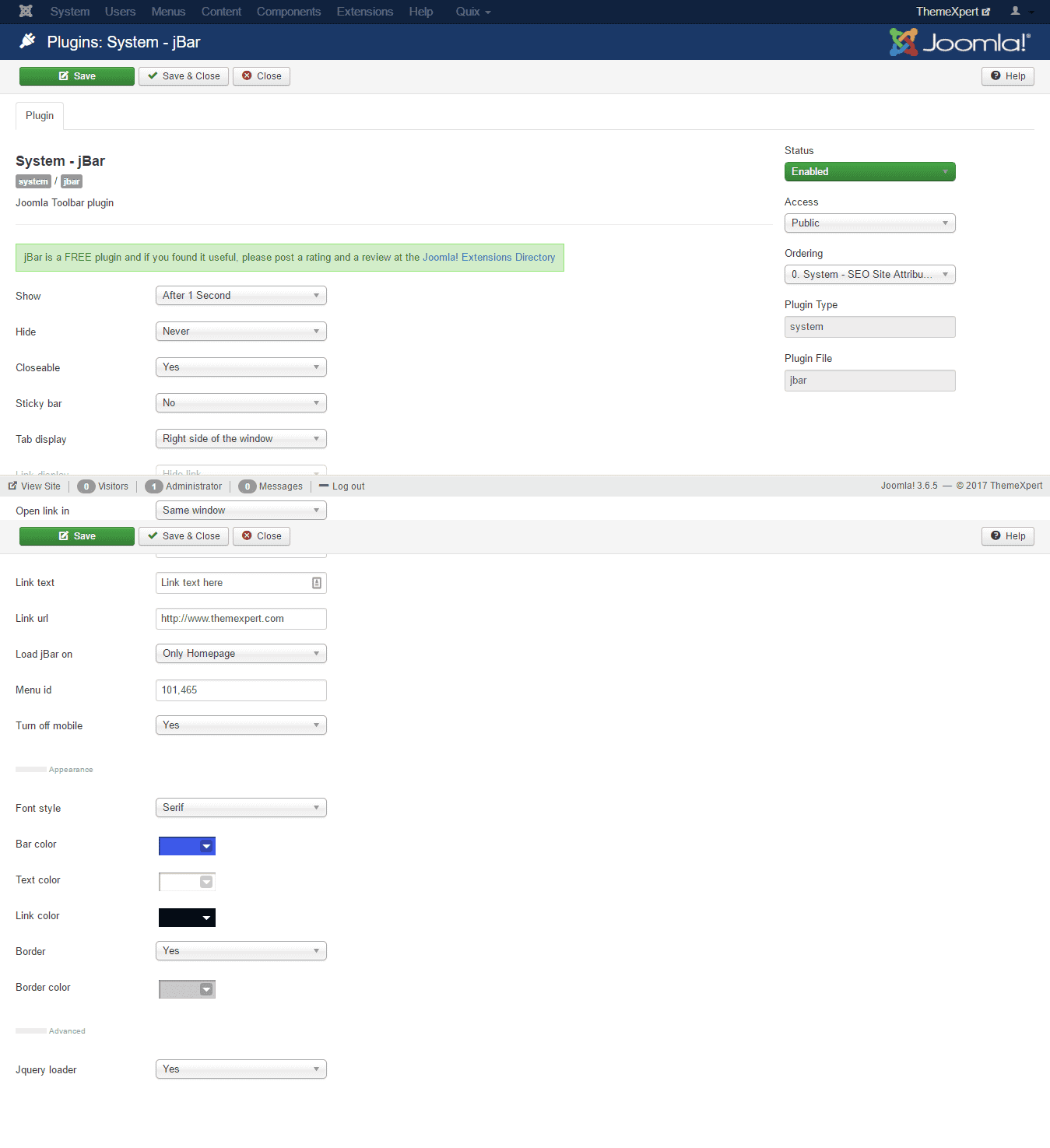- Load jBar on : Define that the jBar will load on Homepage only or selected menu.