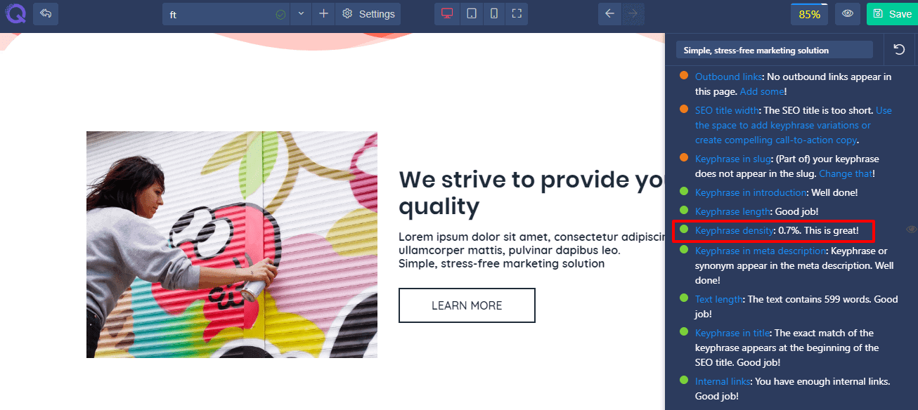 You need to find the right balance in mentioning your keyphrase enough, but not too much. If you overdo it, Google might see that as keyword stuffing. This is not a tactic they appreciate. So how do you know when enough is enough? By keeping an eye on your keyphrase density score in QuixRank, you’ll know to add or remove mentions of your focus keyphrase.