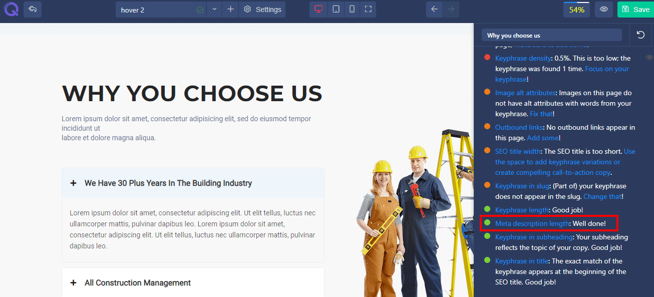 This check measures the length of your meta description. It checks whether it is too short (less than 120 characters) or too long (more than 156 characters).