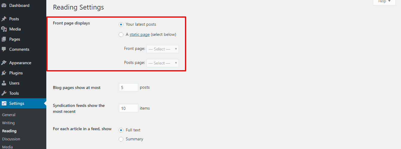 - Choose a "Your latest posts" in first option "Front page displays"