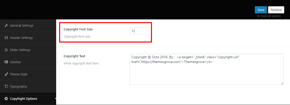 - Copyright Options: Copyright text.