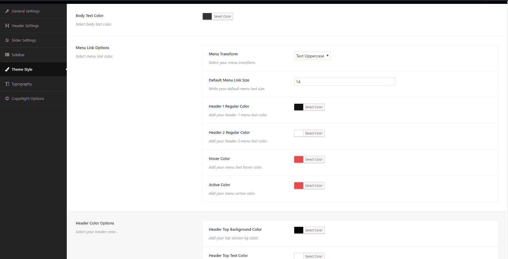 Theme style: Menu Link Color, Header Color, Footer Color.