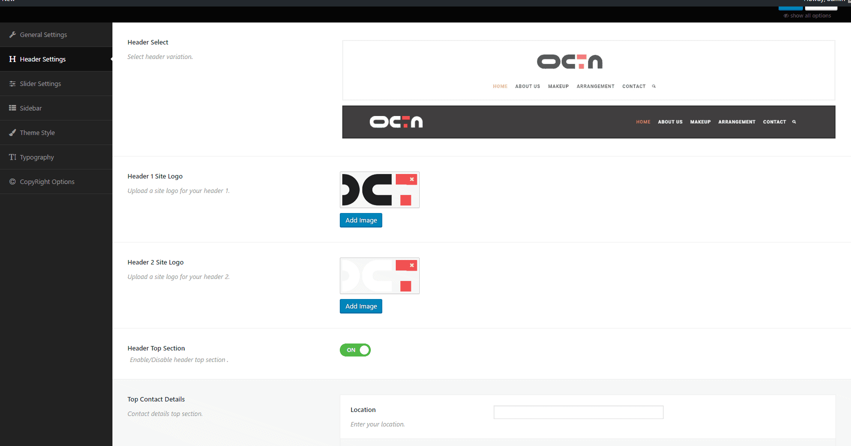 Header Settings: Two Different Logo and Header, Header Top Section Social links.