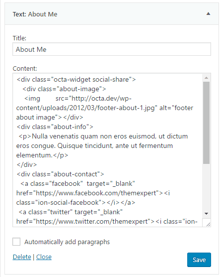 You can find HTML files in /Demo/about-me.html. Copy/Paste on widget text area.