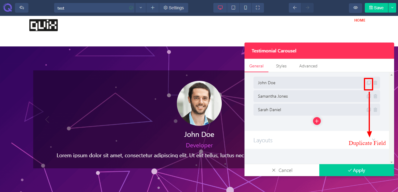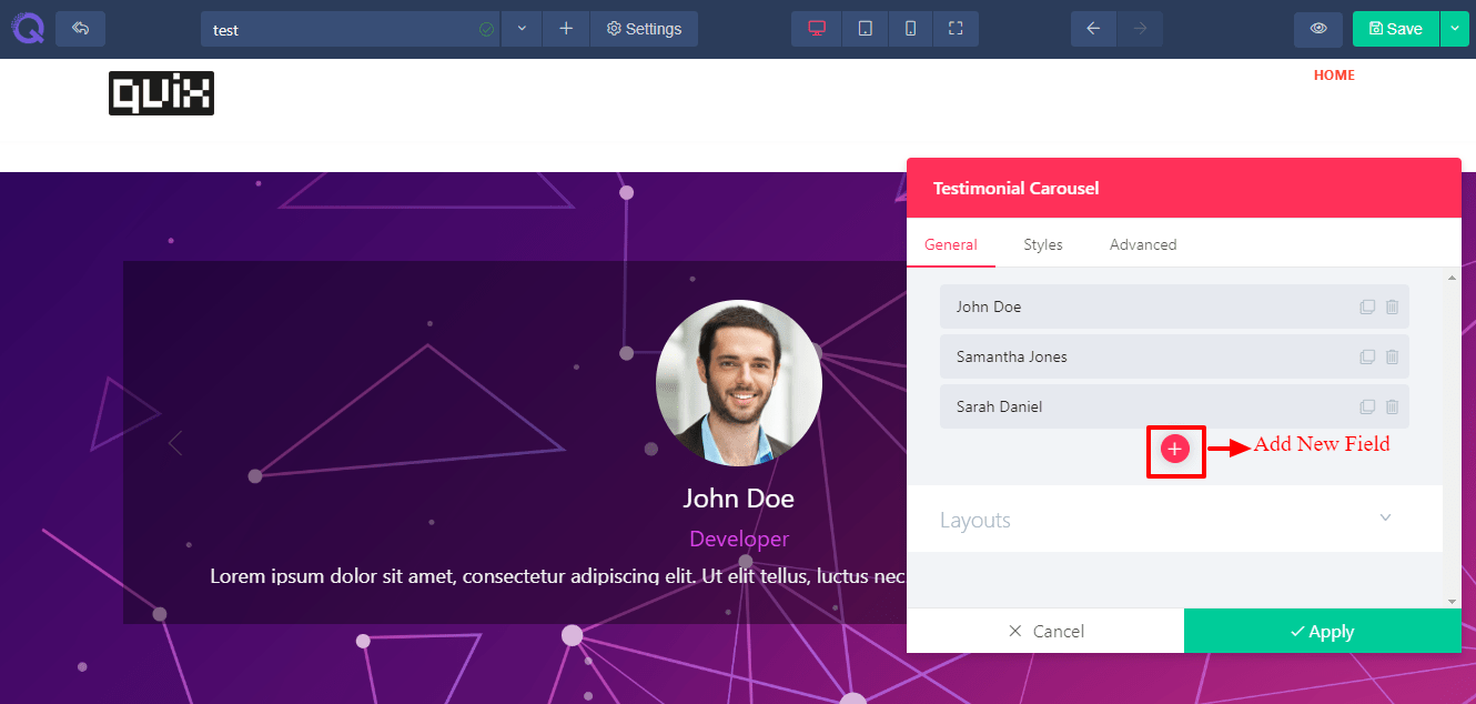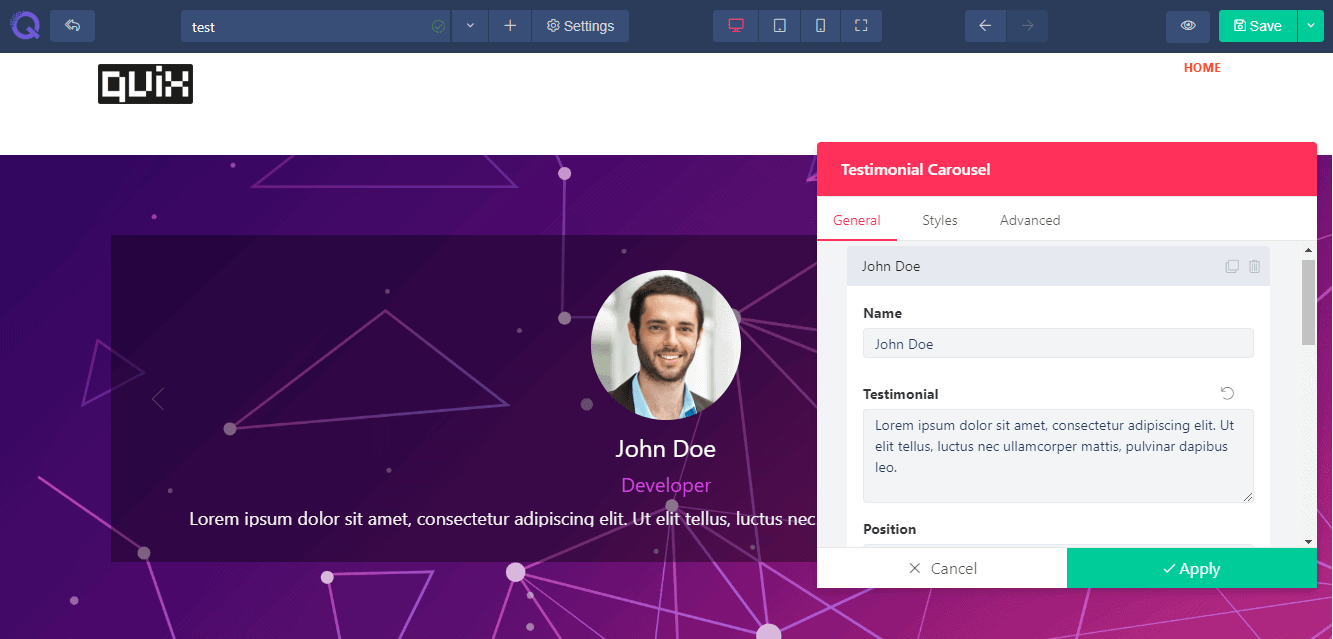 A popup will appear showing three tabs - General, Styles ,& Advanced. These tabs will help you to modify the Testimonials in your way. You can add new fields, change the color and font, change button settings etc. The details are given below.