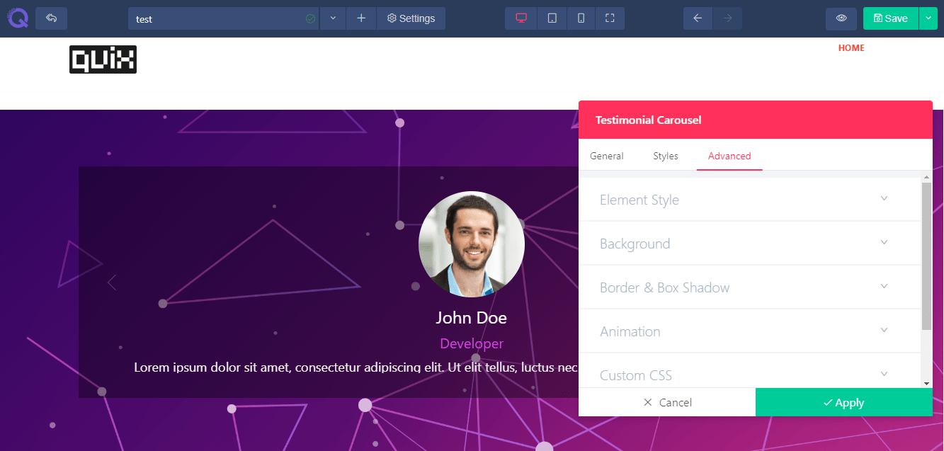 - From there select Testimonial Carousel element