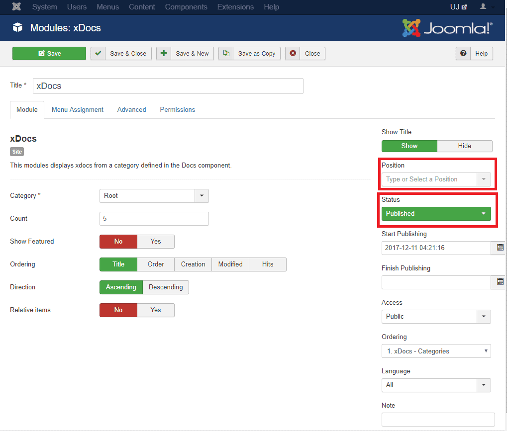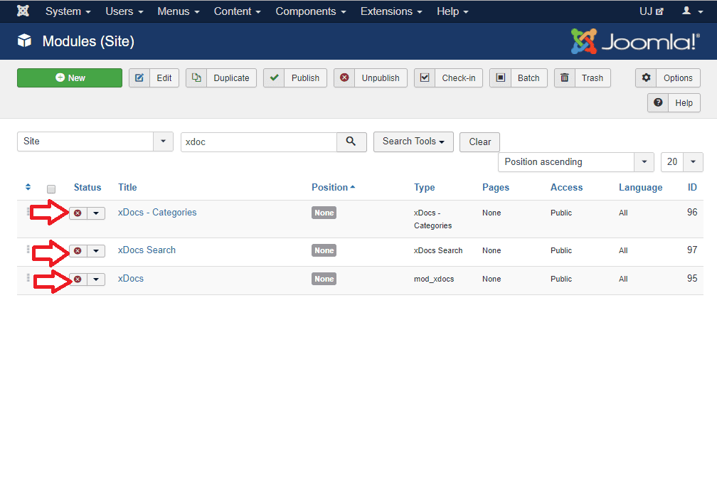 Extensions> Modules - Find the xDocs, xDocs - Categories, xDocs Search and click on the pointed area like the screenshot to enable it. You can use the search box, just write xdocs on the box and hit enter and modules will appear.