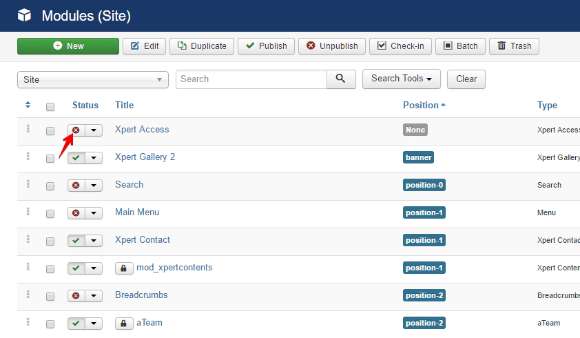 Extensions> Modules - Find the Xpert Access and click on the pointed area like the screenshot to enable it. You can use the search box, just write access on the box and hit enter and it'll appear.