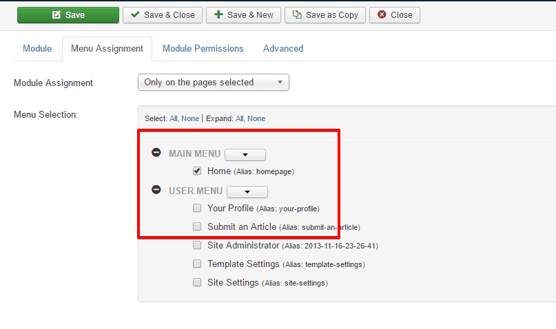 - Under the Menu Assignment tab, select the page in which you want to show the module.