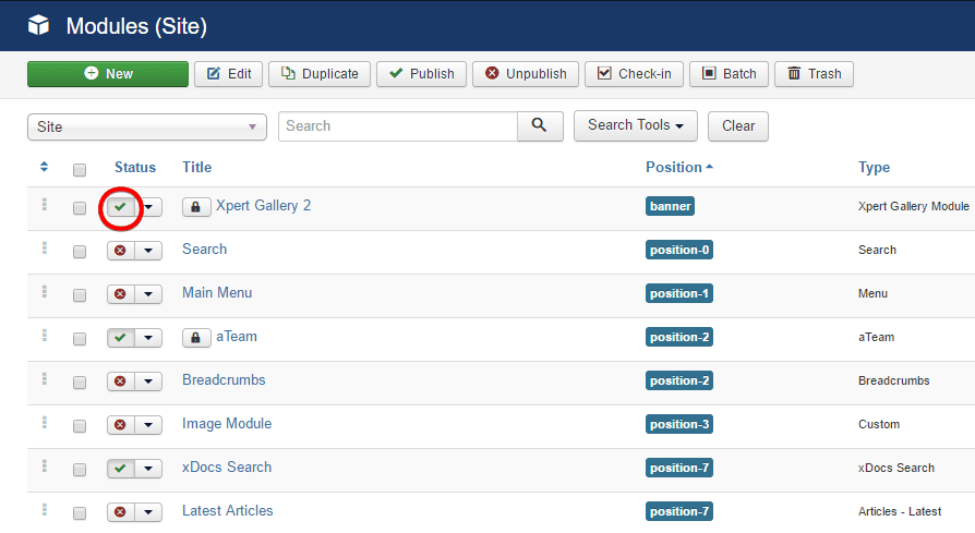 Extensions> Modules - Find the mod_txgallery and click the pointed area like screenshot below in order to enable it.