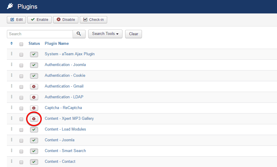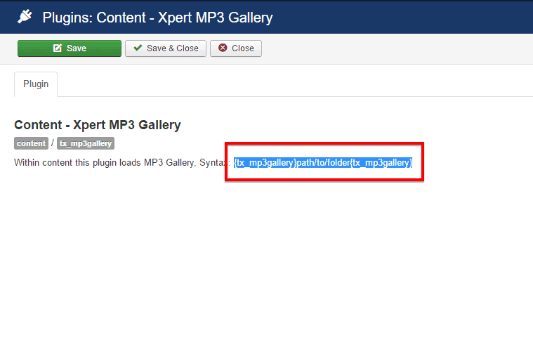 Extensions> Plugins - Find the Content-Xpert Mp3 Gallery and click on the pointed area like the screenshot to enable it.