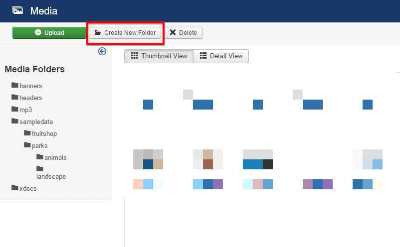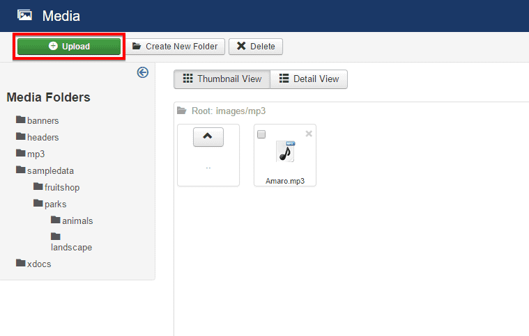 ,mp3at the Legal Extensions (File Types) text box and save the setting like this using Save & Close button at the top. - Create a new folder on Media named mp3 and click on the newly created folder.